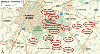Overijse, Tervuren, Hoeilaart, Huldenberg, Ottenburg, Wavre, Rixensart, Auderghem, Watermael-Boitsfort, Wezembeek-Oppem, Waterloo, Rosières, Gembloux, Tombeek et La Hulpe.